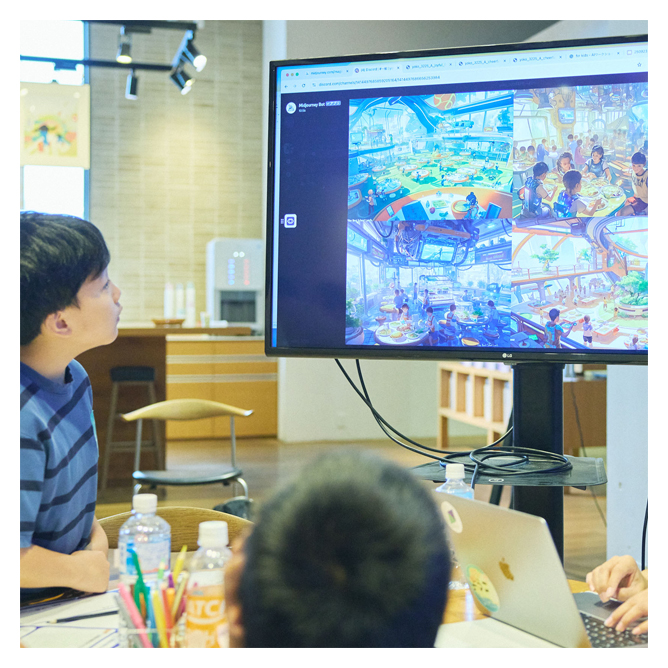 AIと描く100年後の小学校頭の中のアイデアを自由にふくらませ、想像の世界を広げる創造体験。AIと一緒に、これまでにない100年後の未来の学校を描きました。